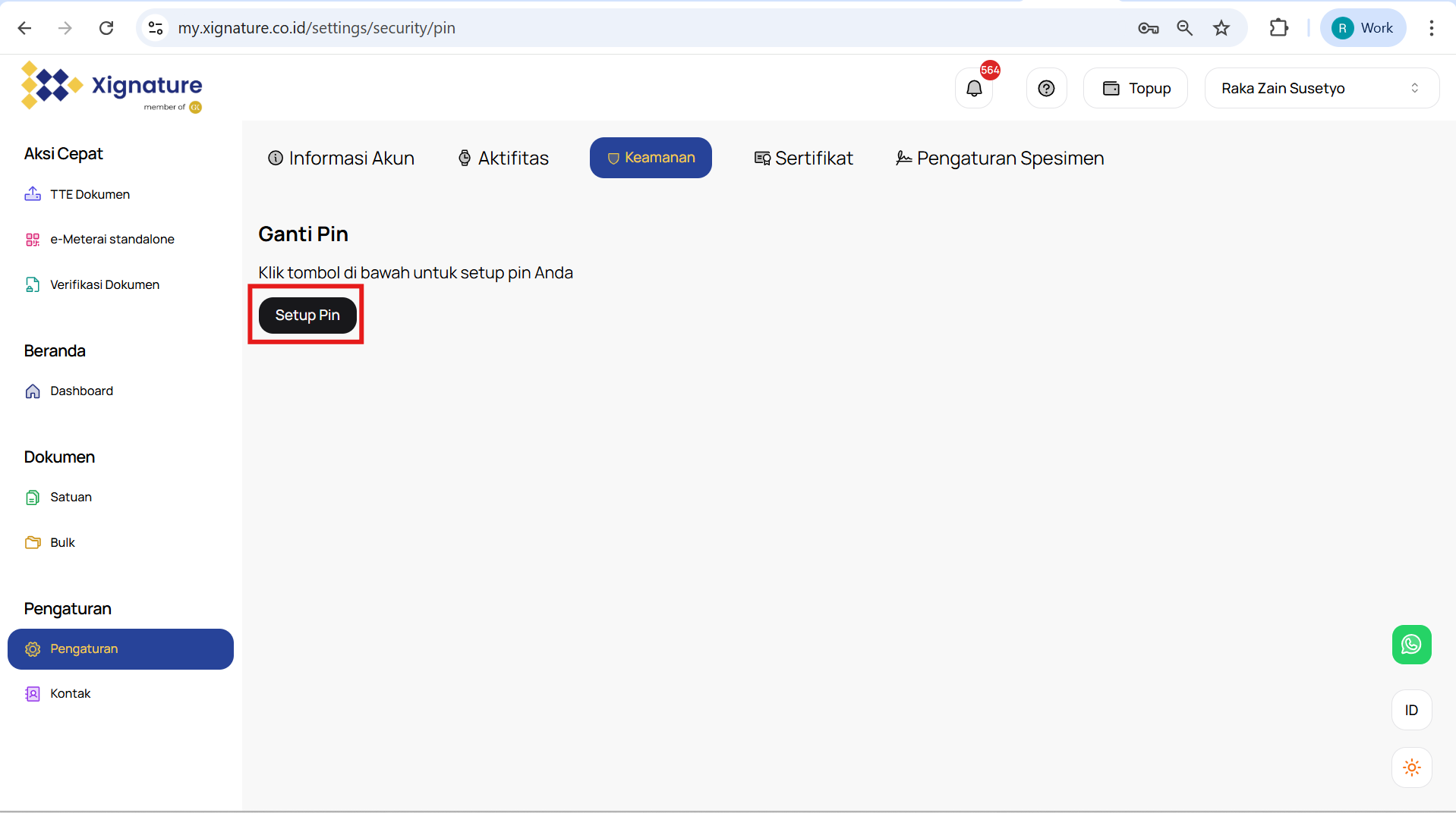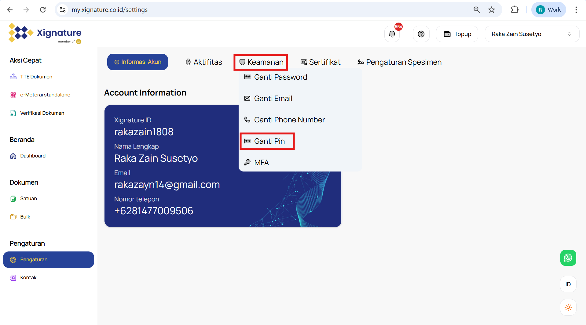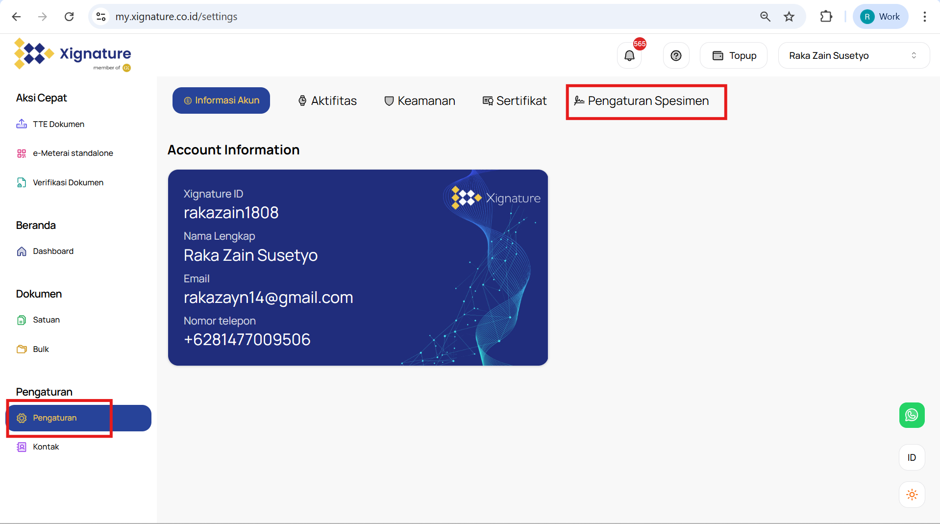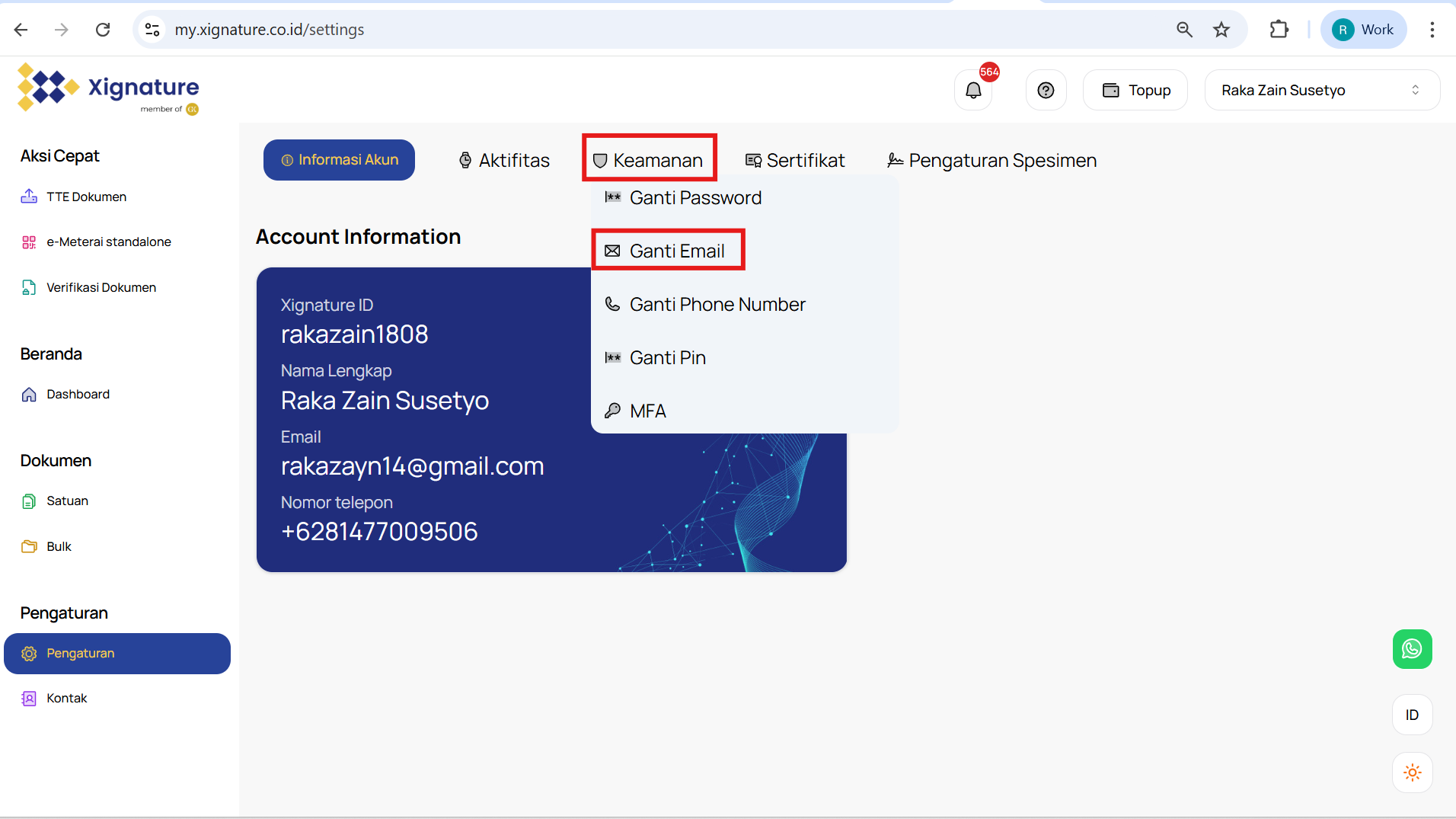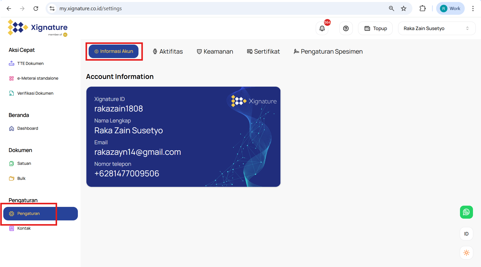Untuk memulai, silakan navigasikan melalui menu "Setting" atau "Pengaturan" di web app XIgnature. Lalu pilih tab "Account Information" Jika Anda memerlukan bantuan lebih lanjut, jangan ragu untuk menghubungi tim XIgnature.