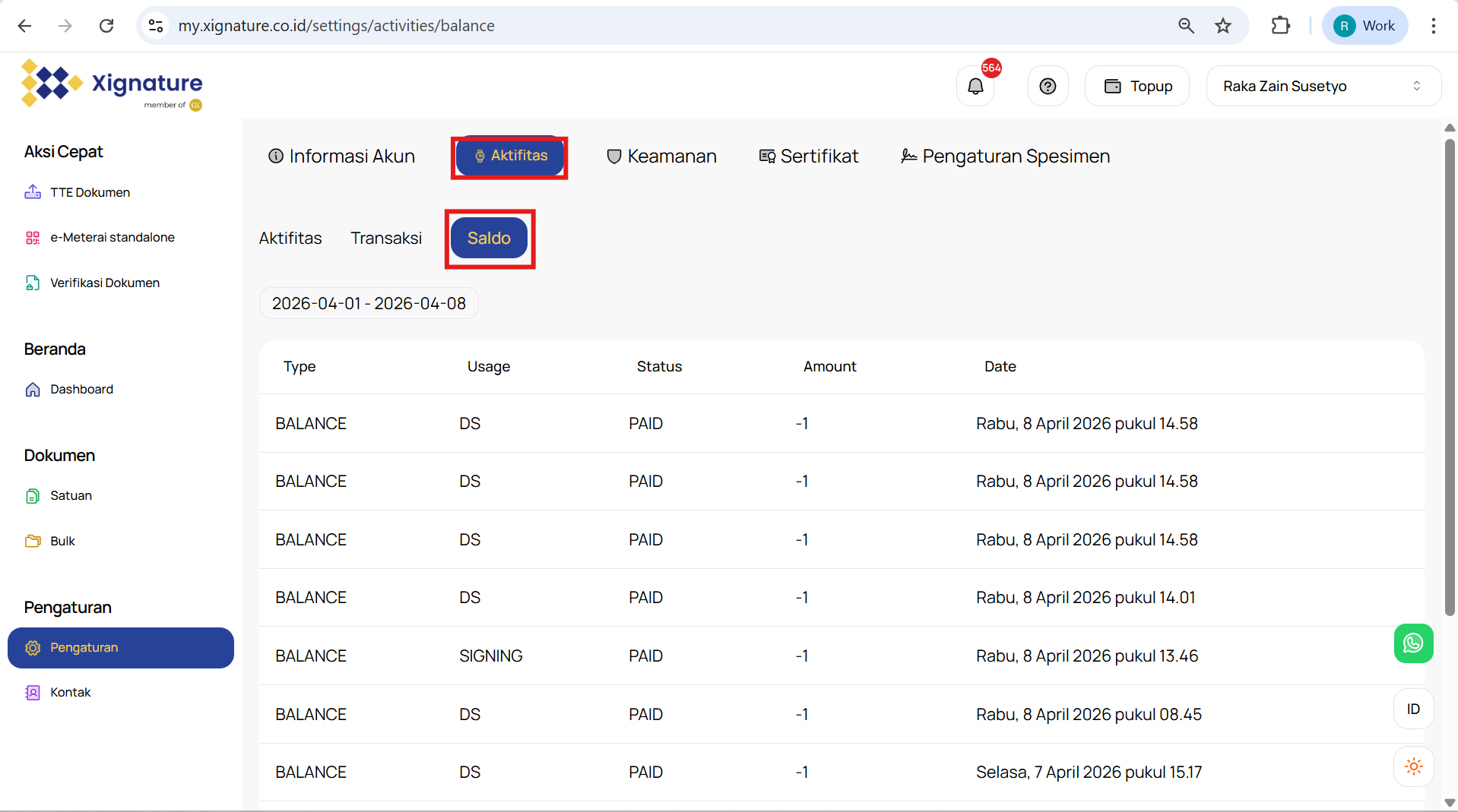 Halaman Balance menampilkan informasi mengenai penggunaan token SIgn dan e-Materai Anda. Berikut adalah informasi yang dapat Anda temukan di halaman ini :