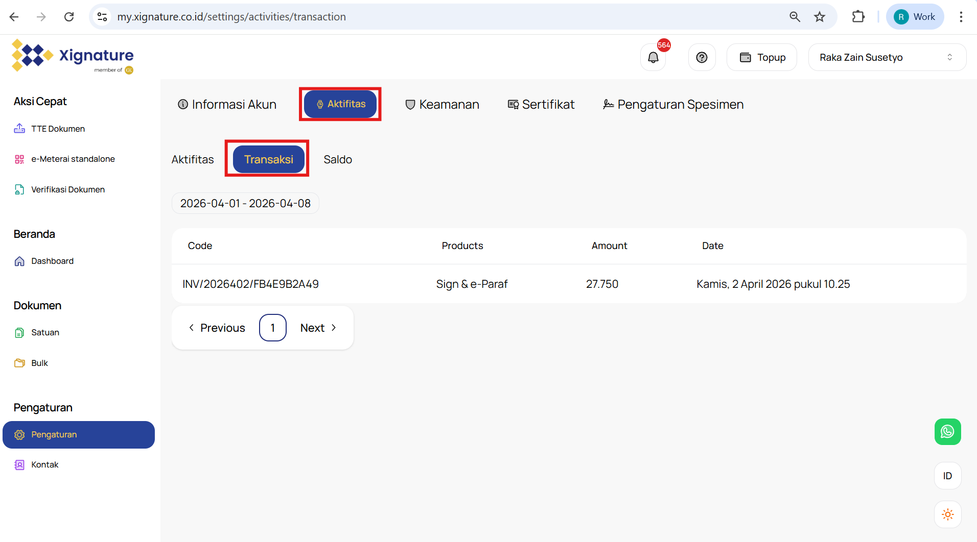 Halaman Transaction menampilkan riwayat lengkap pembelian token Sign dan e-Materai yang telah Anda lakukan. Berikut adalah informasi yang dapat Anda temukan di halaman ini: