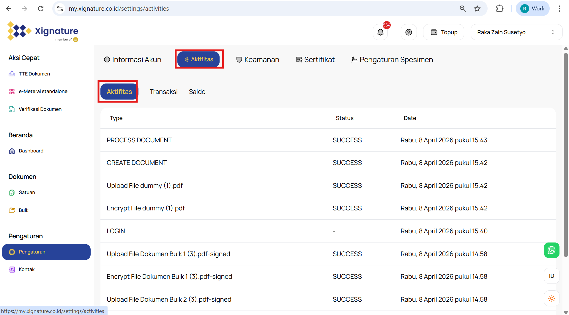- Pemakaian Token Sign: Semua aktivitas yang menggunakan token Sign untuk tanda tangan diigital pada dokumen.
