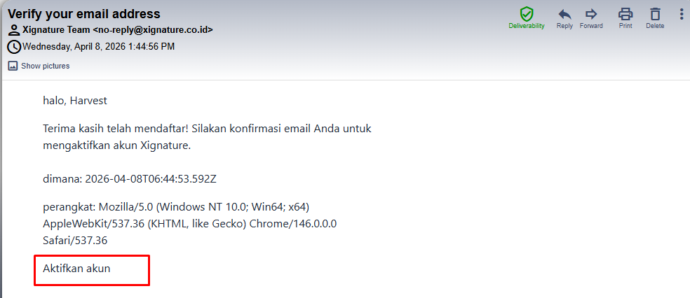 - Cek Kotak Masuk Email: Buka email dari Xignature dan cari email dengan subjek "Aktivasi Akun".