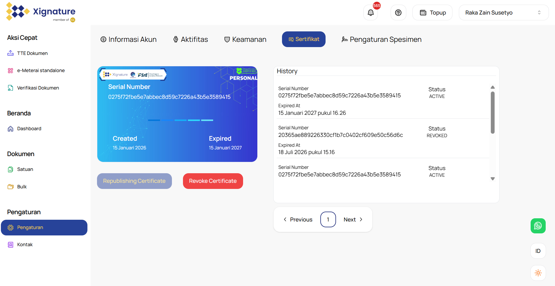 - Menuju Menu "Setting": Masuk ke tab "Setifikat" dimenu "Settings".